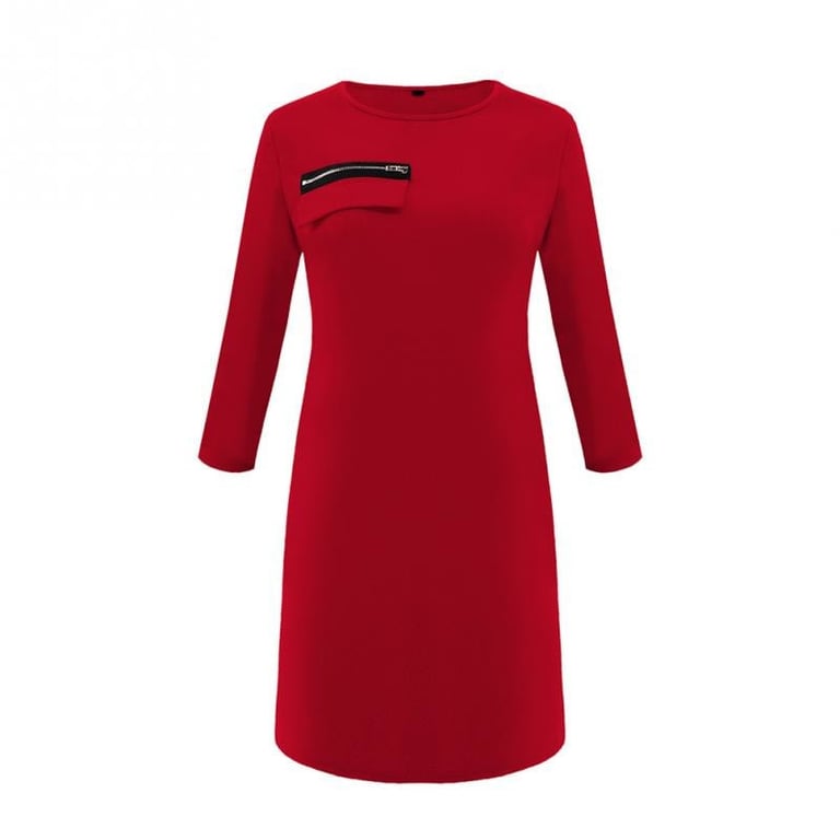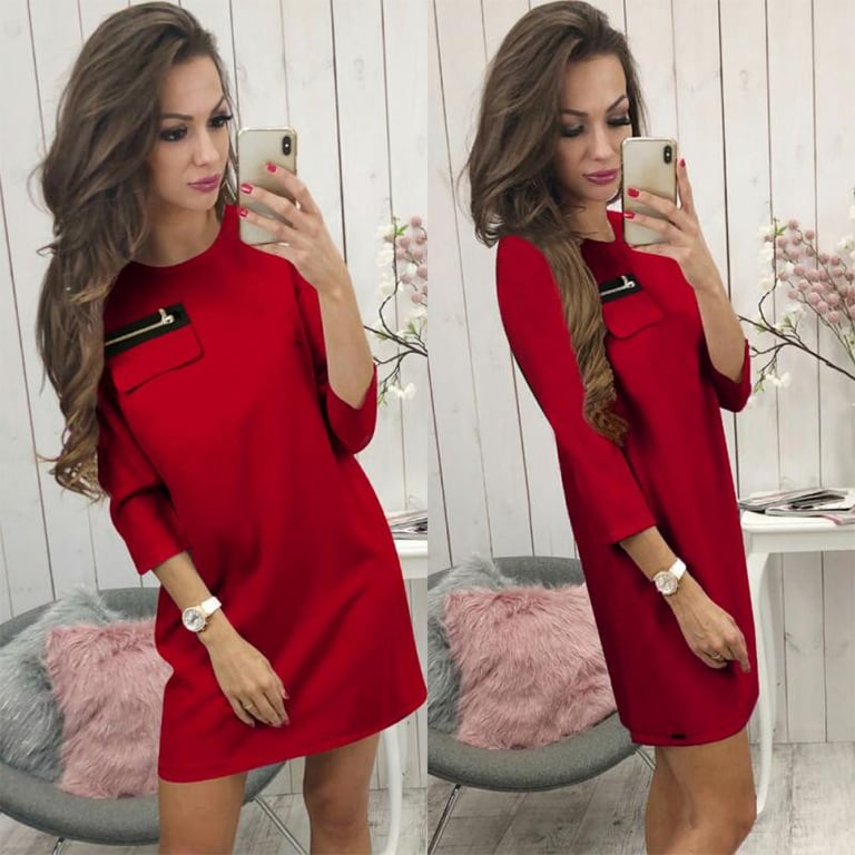 Dames mini jurk met een lengte tot onder de billen en 3/4 mouwen. De jurk heeft een ronde hals en een borstzak met rits. Beschikbaar in drie kleuren.
