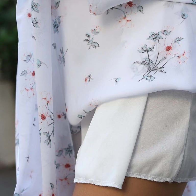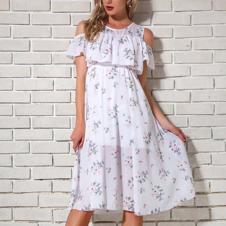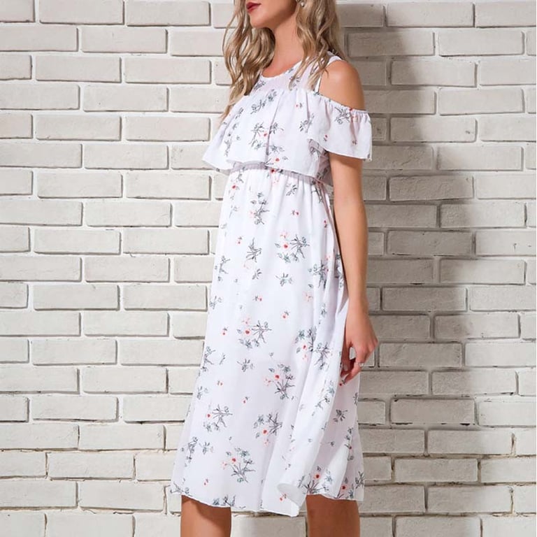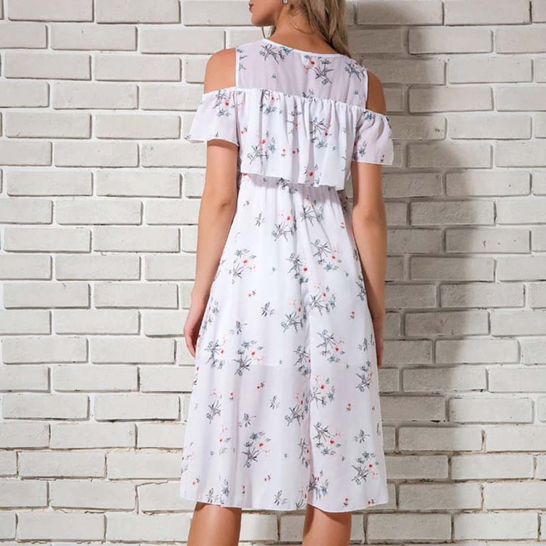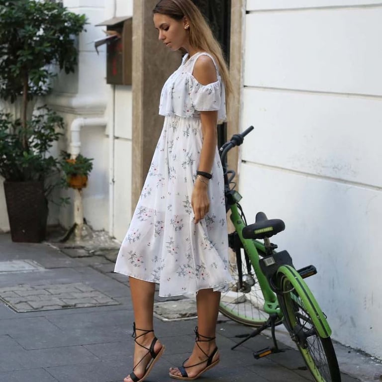 Stijlvolle damesjurk waarin je er absoluut geweldig uitziet. Originele uitsparingen op de schouders en een bloemenmotief passen perfect bij jou.