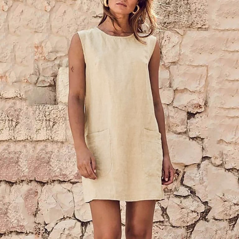 Damesjurk zonder mouwen. Losse korte snit met voorzakken en een ronde hals. Verkrijgbaar in meerdere varianten.