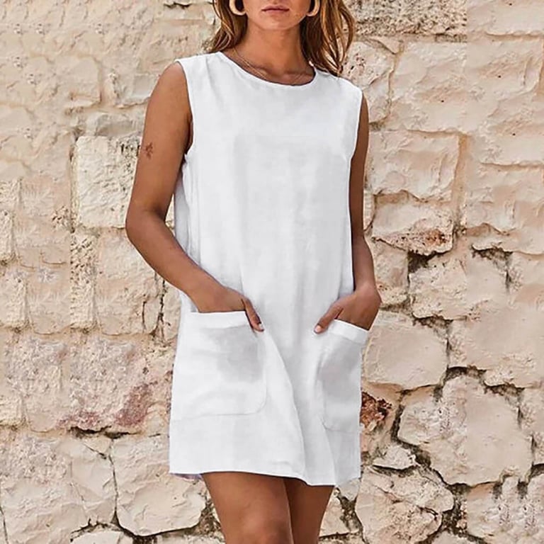 Damesjurk zonder mouwen. Losse korte snit met voorzakken en een ronde hals. Beschikbaar in meerdere varianten.
