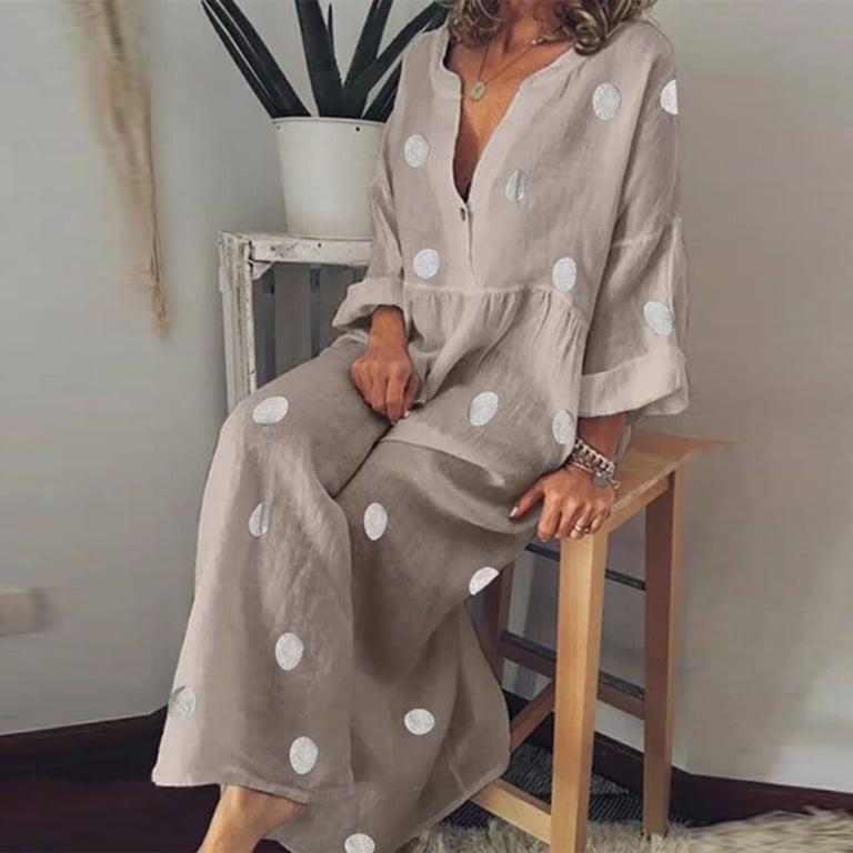 Dames lichte jurk met stippenpatroon. Lange losse snit met lange mouwen en een V-hals. Verkrijgbaar in meerdere kleuren en maten tot 5XL.