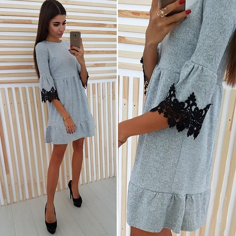 Damesjurk met een losse pasvorm en een lengte boven de knie. De jurk heeft een ronde halslijn en 3/4 mouwen versierd met kantafwerking. Beschikbaar in twee kleurvarianten.