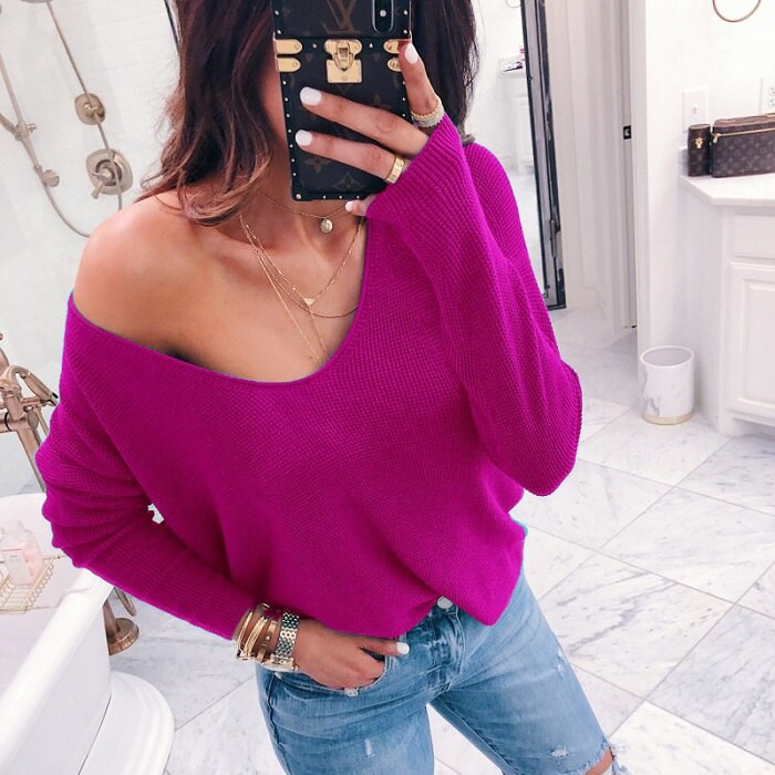 Damestrik met V-hals. Vrije, comfortabele pasvorm. Lange mouwen. Verkrijgbaar in meerdere kleurvarianten.