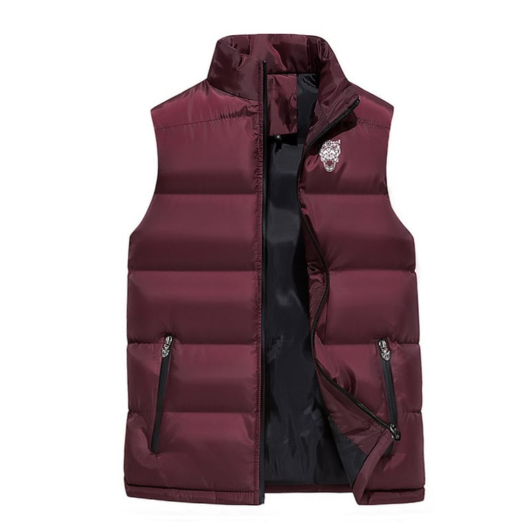 Mannelijke winter gewatteerde vest met een opstaande kraag en twee zijzakken. Beschikbaar in vier kleurvarianten.