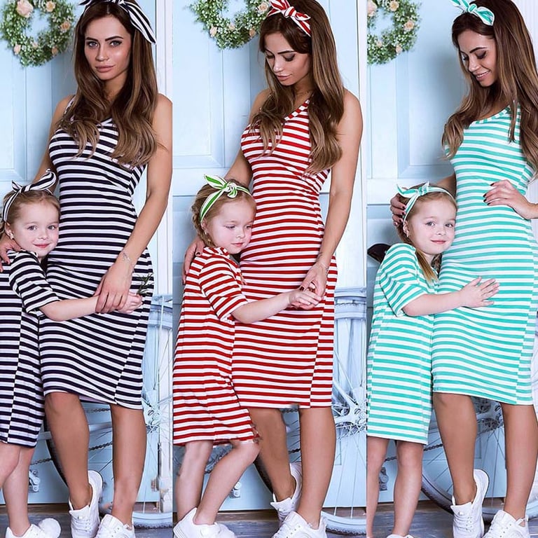 Mooie jurkjes voor mama en dochter, die perfect zijn voor elke lente- of zomerse gelegenheid. Jullie zullen er geweldig uitzien en de strepen zullen jullie beiden mooi laten stralen!