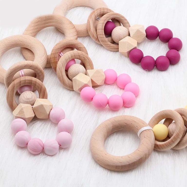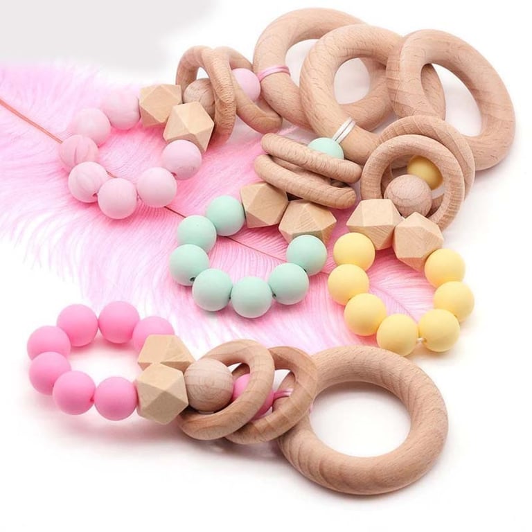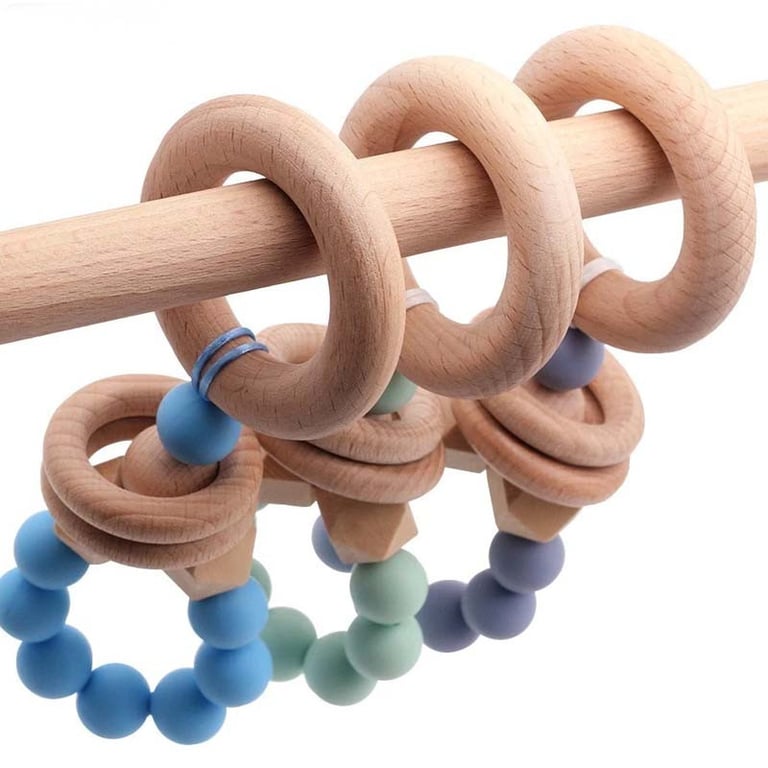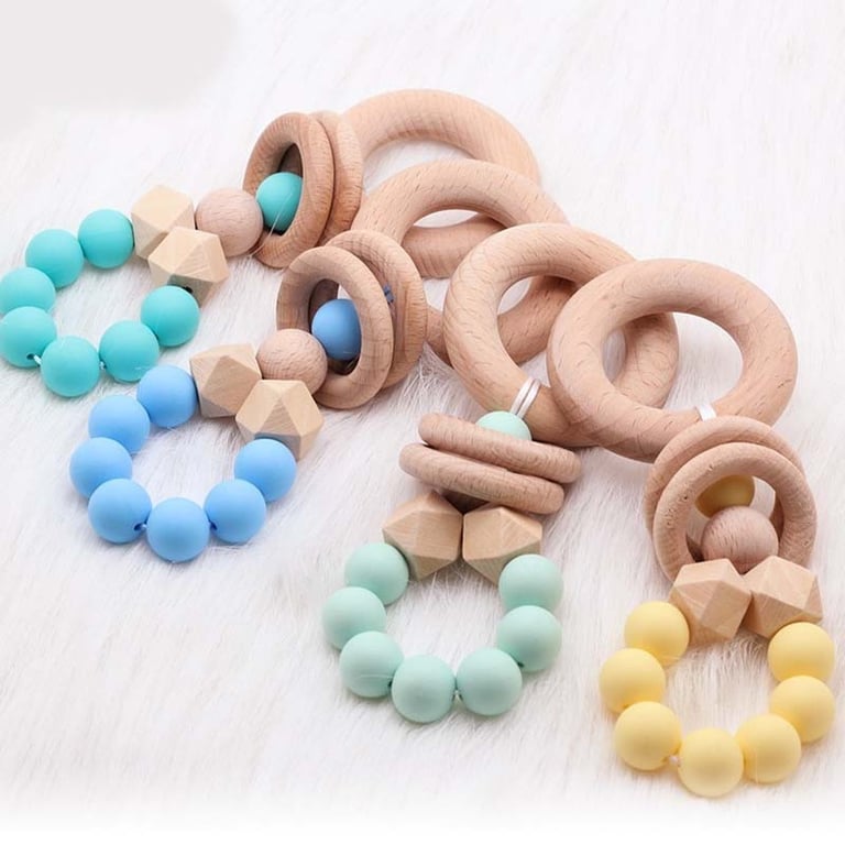 Stijlvolle rammelaar van siliconen kralen met houten ringen, die kinderen zeker zal aanspreken.