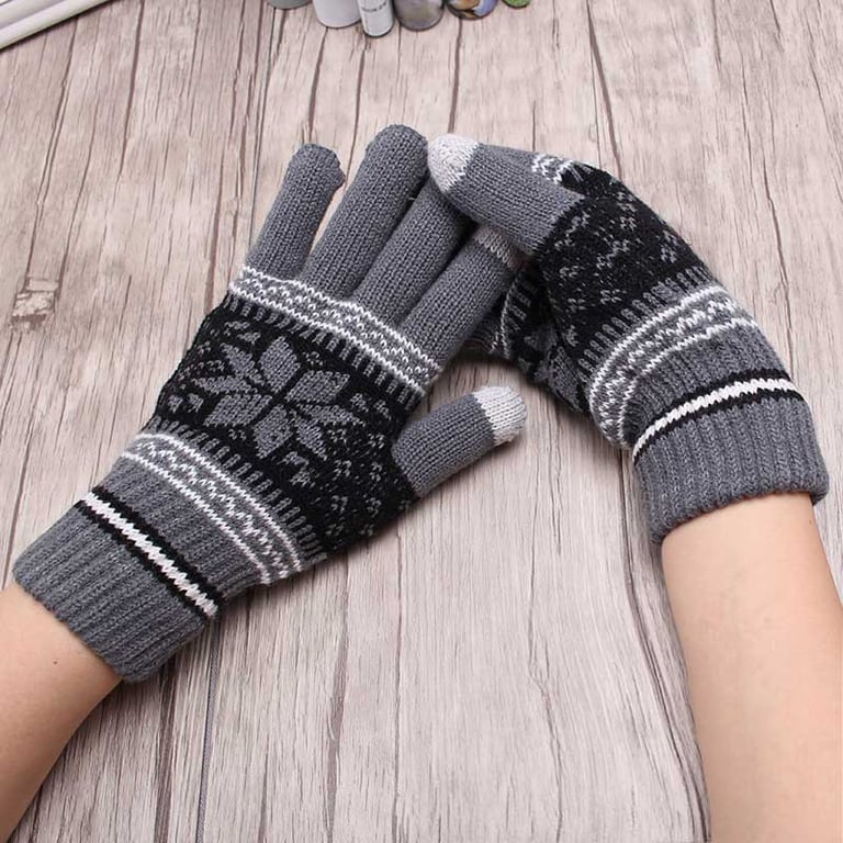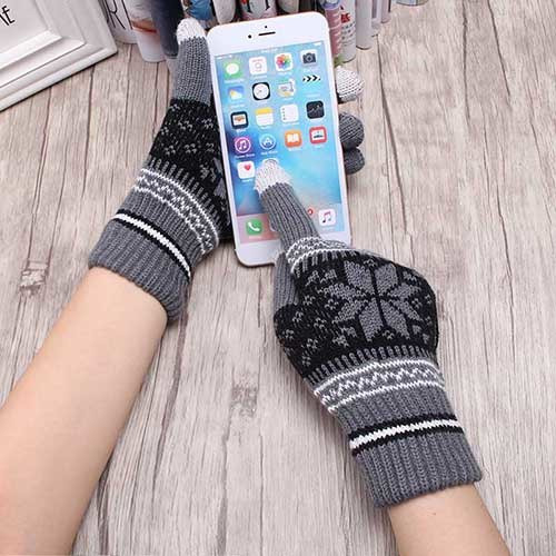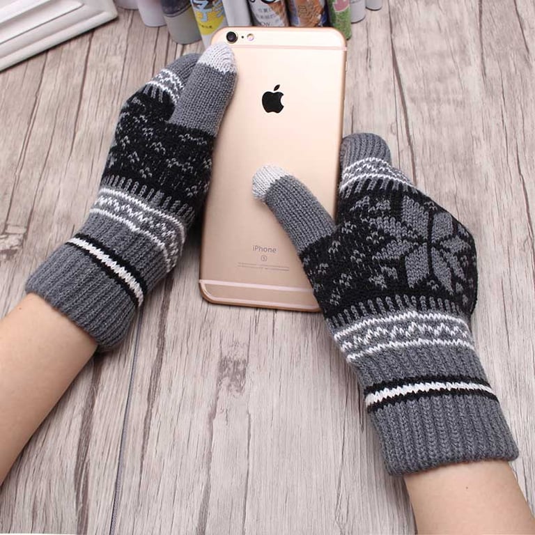 Dames gebreide winterhandschoenen met sneeuwvlokpatroon. De handschoenen hebben geleidende materialen op de vingertoppen. Hierdoor kunnen ze worden gebruikt om touchscreen displays te bedienen.