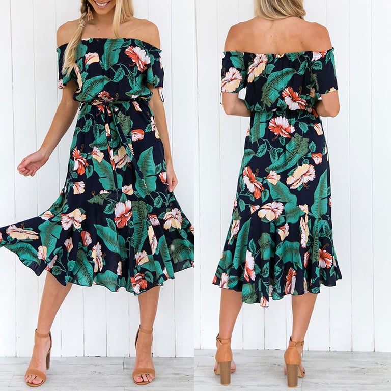 Bloemen zomerjurk met schouderbanden en een strik in de taille.